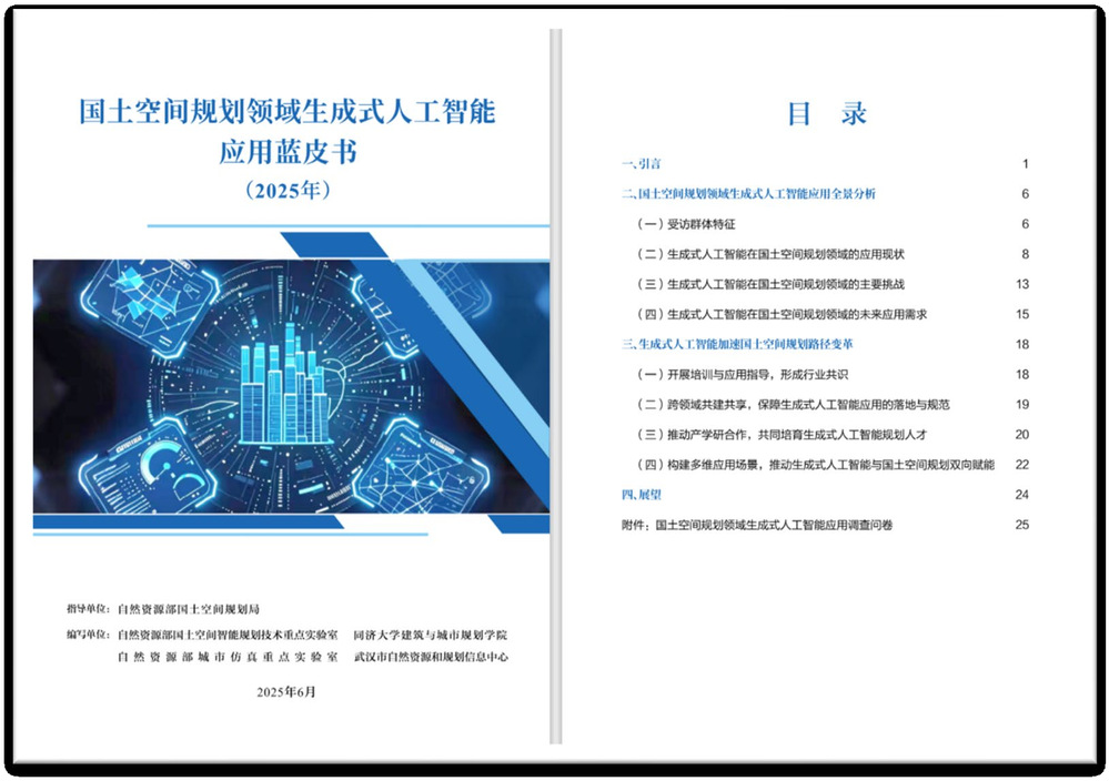 为深入贯彻落实国家关于开展“人工智能+”行动的战略部署,加速生成式人工智能技术赋能国土空间规划,自然资源部国土空间规划局积极组织推进系列工作。其中,为全面、系统地掌握生成式人工智能在国土空间规划领域的研究现状、应用需求以及未来发展前景,组织开展了面向国土空间规划领域生成式人工智能应用的问卷调查,具体由同济大学建筑与城市规划学院牵头建设的自然资源部国土空间智能规划技术重点实验室、武汉市自然资源和规划信息中心牵头建设的自然资源部城市仿真重点实验室联合发起。基于该问卷调查,形成首部《国土空间规划领域生成式人工智能应用蓝皮书(2025年)》(以下简称“蓝皮书”)。蓝皮书于2025年6月27日在武汉举行的第十八届中国智慧城市大会上正式发布。