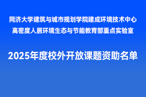 同济大学建筑与城市规划学院建成环境技术中心2025年度校外开放课题申报和评审工作已经结束。开放课题以“公平竞争、择优支持”的原则,以创新性、开拓性及具有较强应用前景的标准,遴选资助建筑学、城乡规划学、风景园林学等相关学科中与高密度人居环境生态与节能教育部重点实验室研究方向吻合,应用背景明确、具有学术和社会经济意义的基础研究、应用基础研究。2025年度入选资助校外开放课题10项,每项课题资助额度3万元,执行期2年(2025年12月1日至2027年11月30日)。序号课题编号单位姓名职称课题名称120250101重庆大学宫聪副教授高密度山地城市公共空间出行疗愈机制研究220250102哈尔滨工业大学庄典副研究员知识-数据双轮驱动高层住宅建筑室内空间识别技术研究320250103天津大学宋祎琳副教授高密度城区三甲医院更新模式与空间配置研究420250104武汉大学蔡萌讲师高密度城市视觉环境对行人情绪异质性影响机制研究520250105复旦大学陈神飞博士后基于视网膜对比度调控的阅读光环境优化与近视防控研究620250106首都师范大学张雪讲师时空间行为视角下高密度城市中混合居住社区建成环境对居